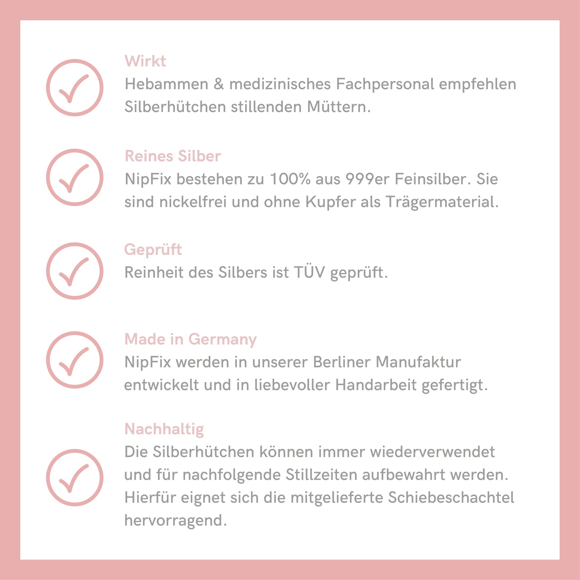 NipFix Silberhütchen für wunde Brustwarzen nach dem Stillen, TÜV-zertifiziertes 999er Feinsilber, Made in Germany, 2er Set